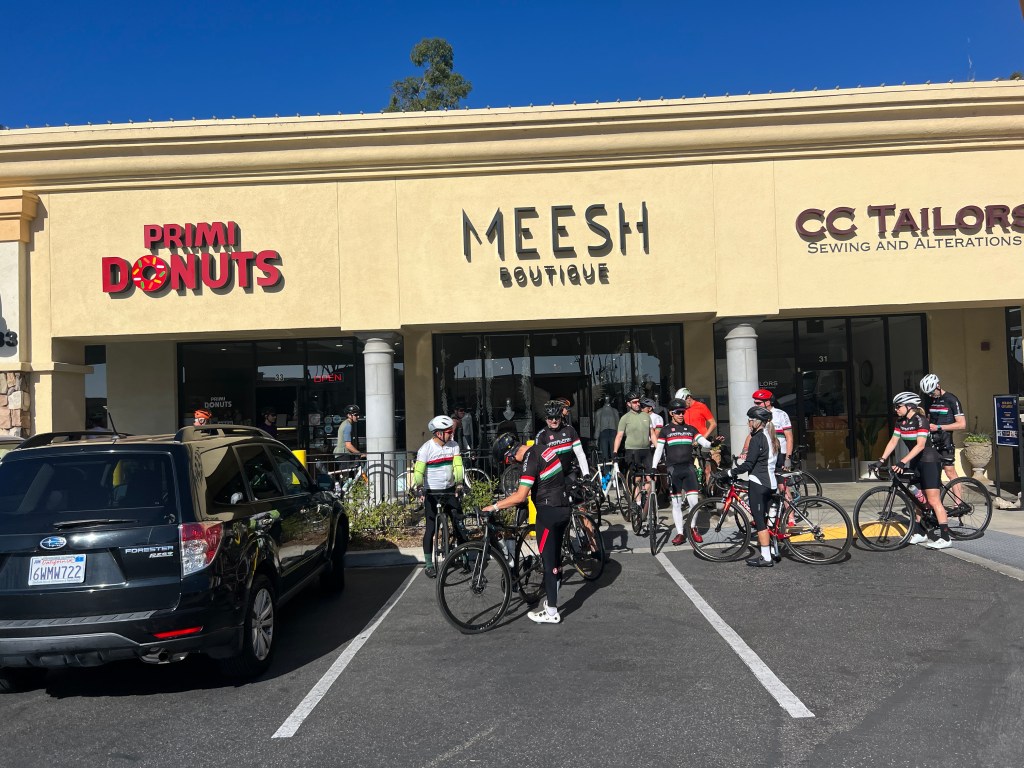 Mile 33: SECOND STOP. Donut shop. I peeled off another layer. Sun was out for a perfect day of riding. Coffee, apple fritter. Pics and friends.