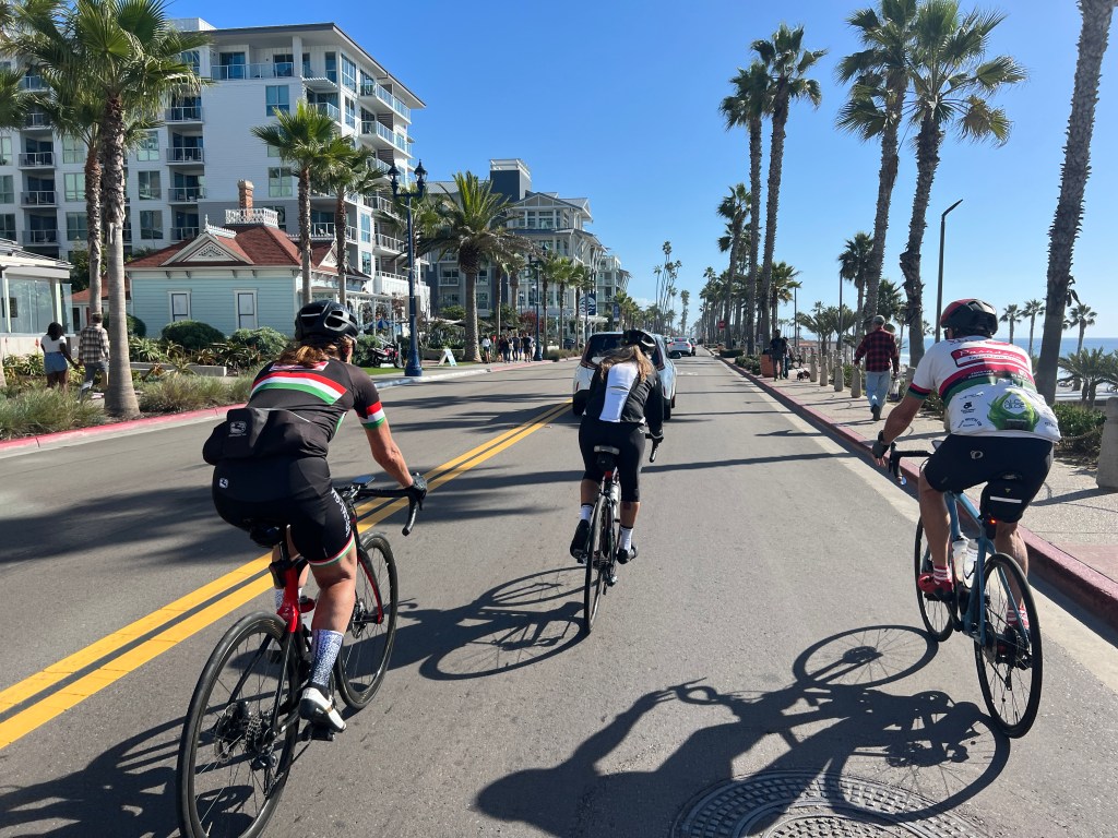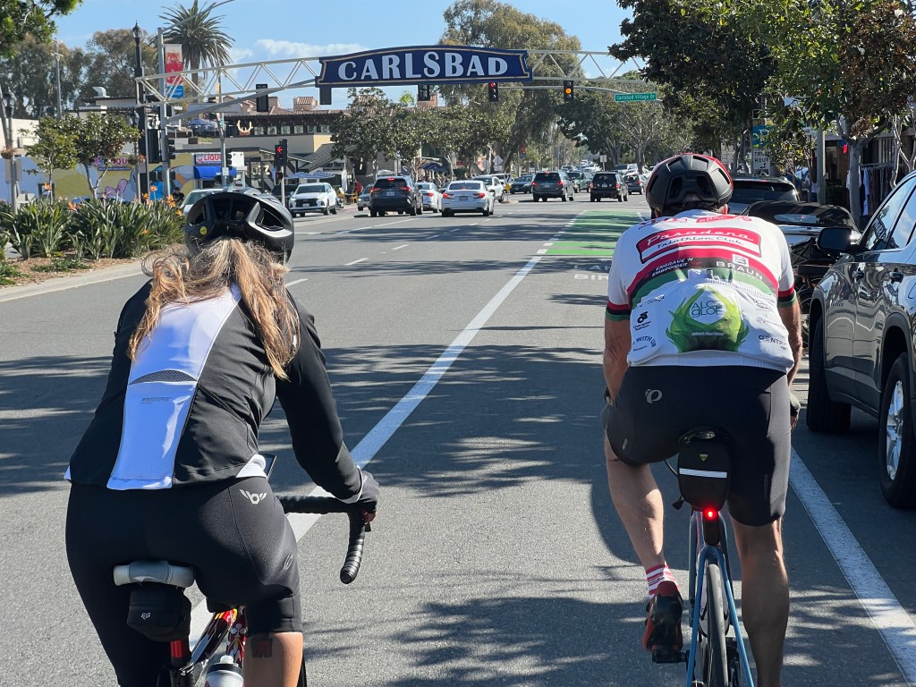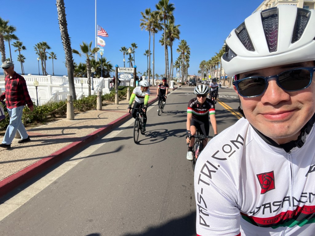 Mile 62: THIRD STOP. Mobil gas station right in Oceanside at the first freeway offramp. Everyone was waiting for me. B Group took off with me. Thanks for waiting. Awesome crew. From Oceanside it was a fairly straight shot south to Solana Beach. Through Oceanside, we dropped down to Pacific St. This is the run course for the 70.3 Oceanside race.