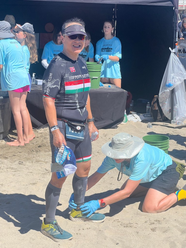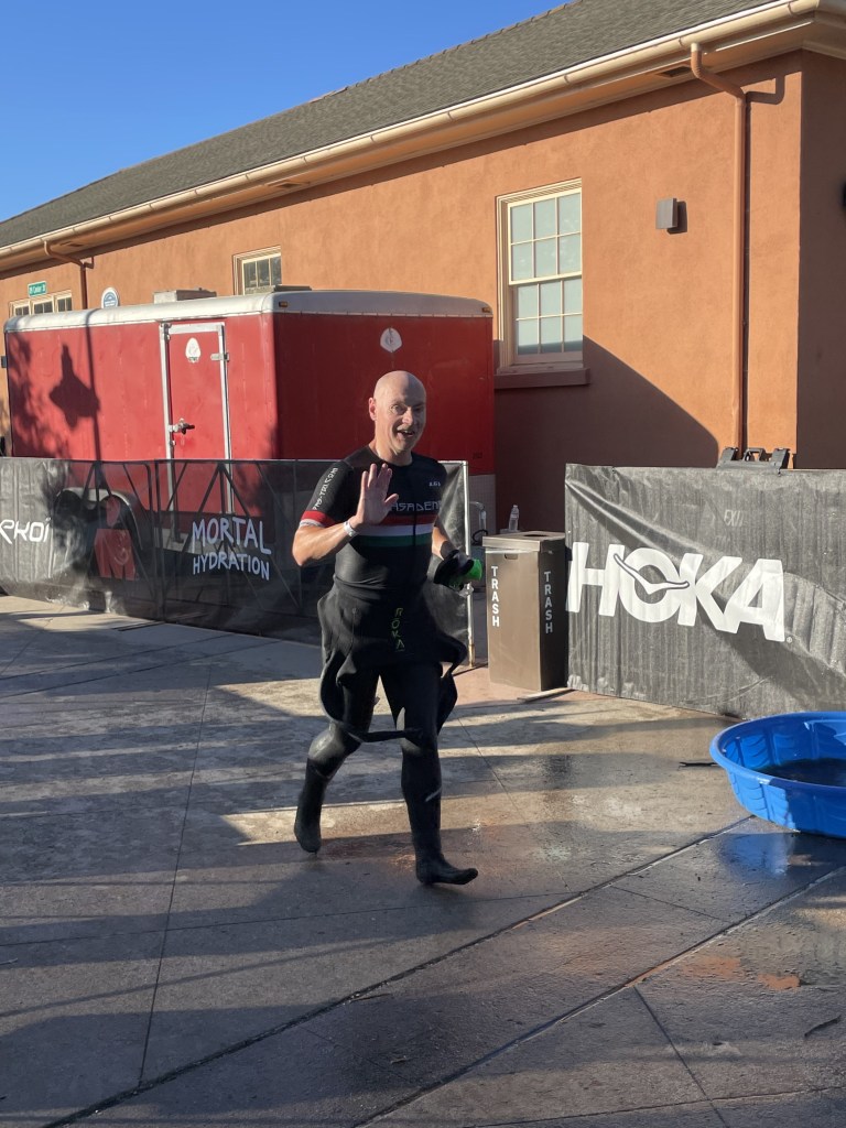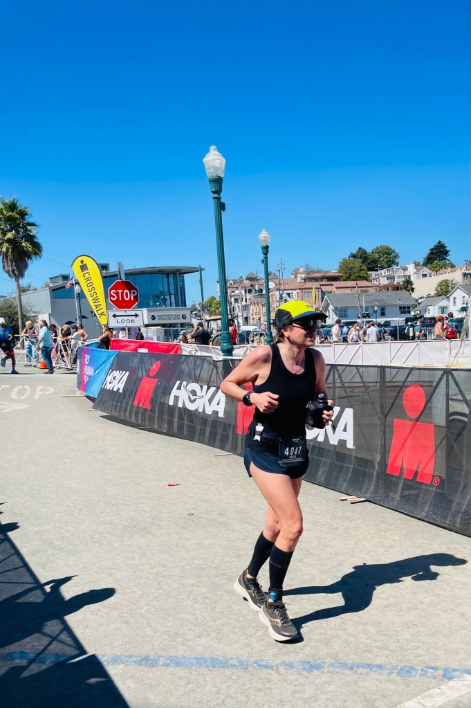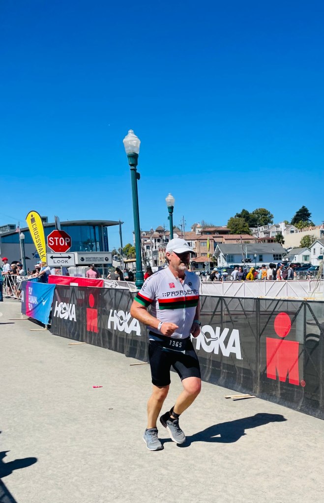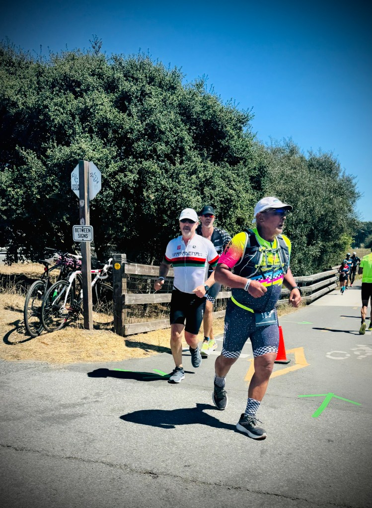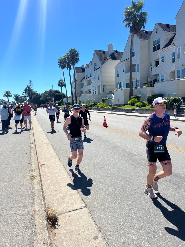 Rack was close to the bike out. The bike route was great. Mile 1-3 was along the bluffs along the beach. Beautiful scenic route. The rolled through the neighborhoods for a couple miles, then onto Pacific Coast Highway, for an out and back. One lane and the shoulder for racing. Very little car traffic. There was more hills than I remembers last year. The memory fades apparently. My belly felt good today, total blessing. My legs didn’t feel particularly strong, but I felt I could definitely grind it out good today. There were rollers 5-6% and some steep rollers 9-10%, but nothing too long. The down hills were terrific for aero. At Aid Station #1, I took a super short potty stop. Total worth it. I didn’t have to stop for the rest of the ride. The view during the ride was spectacular. Ocean waves crashing on the rocks. Rolling hills, farms, fields. Mile 20-28 before the turn around spot, the head winds were pretty strong. Super glad to turn around and get the tail winds. As I turned and picked up the speed, there was no sounds of wind for awhile, so the wind was probably 15mph at least. On one of the descents I hit a top speed: 44.7 mph. Wahoo!