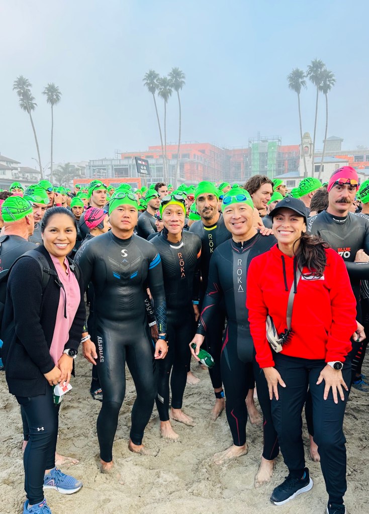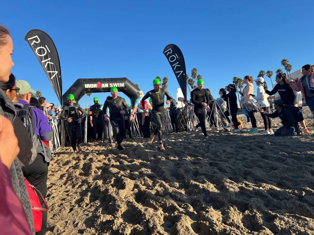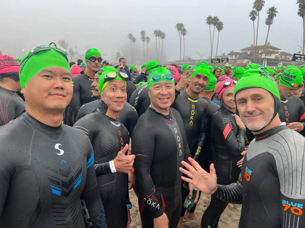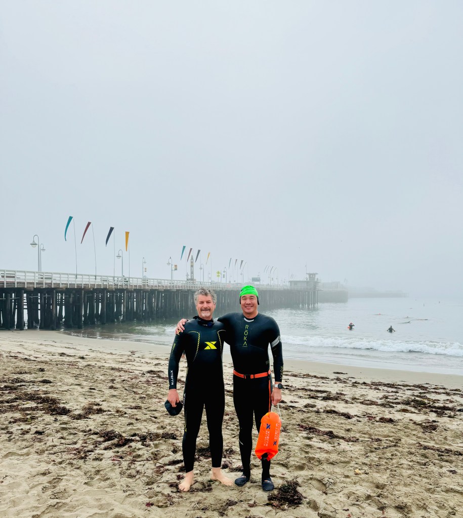 5:45a. Foggy and dark in the morning. We walked half block and set up transition. I set up bike gear and then walked back to the VRBO. Jack’s bike had a flat in the mornings. Uh-oh. It was a scare, but he got it taken care of. Potty break back at the VRBO was perfect. I squeezed into the wetsuit and then walked down to the Pier. By 7a, the sun was lighting up the sky and burning off most of the fog. Jack and I jumped into the water to ‘warm up’. 59F. Not too cold. I was wearing my thermal ROKA cap and Blue Seventy booties with my ROKA wetsuit. Felt good. No waves. No current. No swells. Perfect swim conditions. I lined up at the 37-40 minute group with Paul. We started at 7:34am. I lined up with Paul.