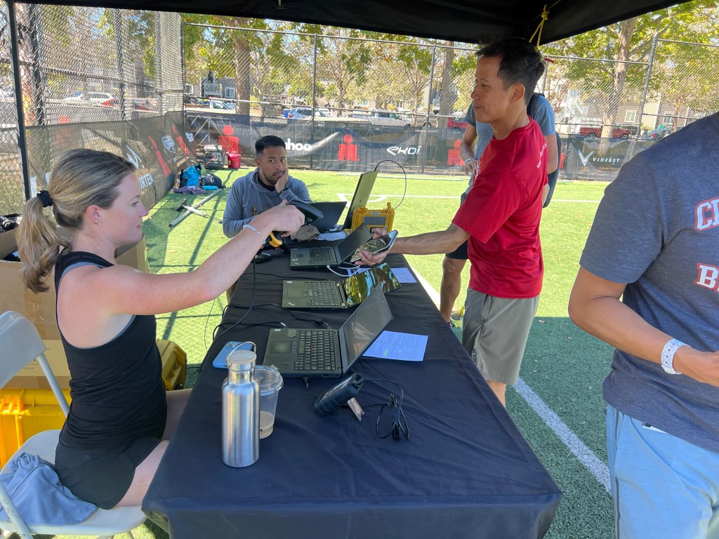 The booties also help on the long run / walk to the transition area. Kiddie pool entering transition to wash off the sand. The soccer field was nice and soft to run on. I saw Marisa at the Bike Rack. I wore EKAI helmet, squeezed into a PTC jersey. No vest. Sun was out. Small bottle of water to wash off sand from my feet. Rolled socks on. Walked my bike out. Saw Maria cheering as I left the Transition.