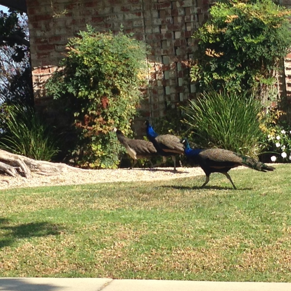 Patty and Pearl peahens pecking